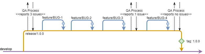 At the end of the release process, once QA confirms that there are no more issues detected, a tag is created to denote the corresponding version and the release branch is merged into develop and deleted.